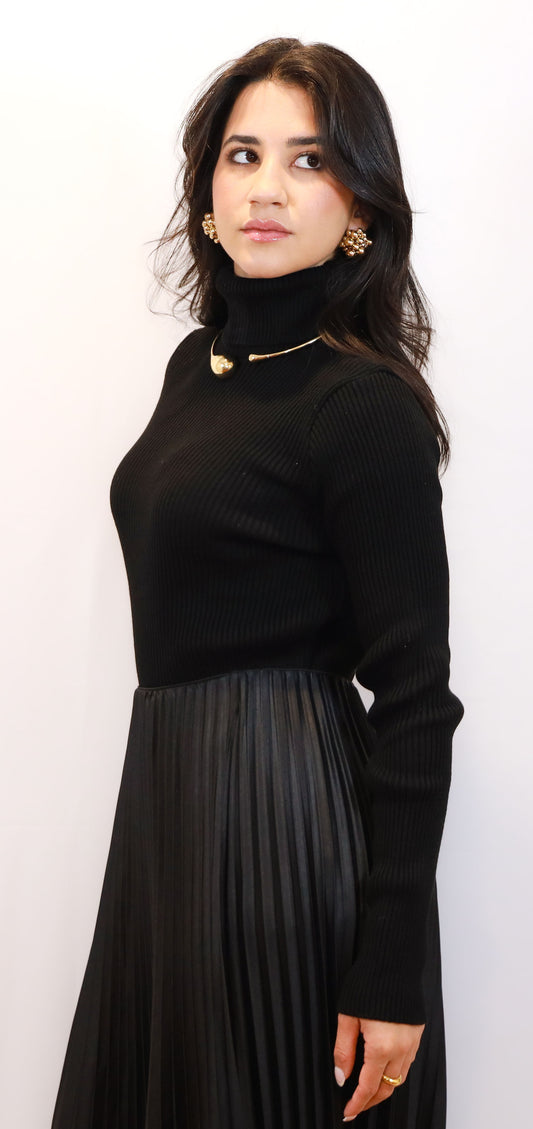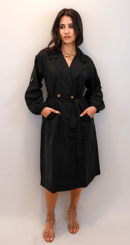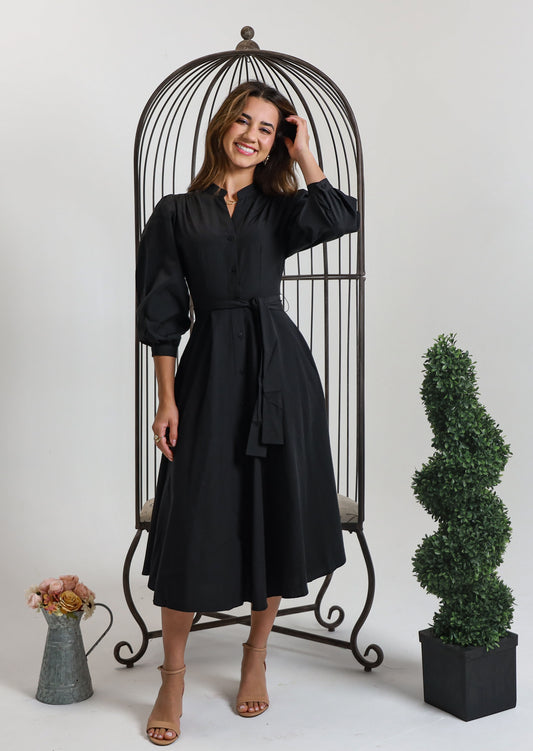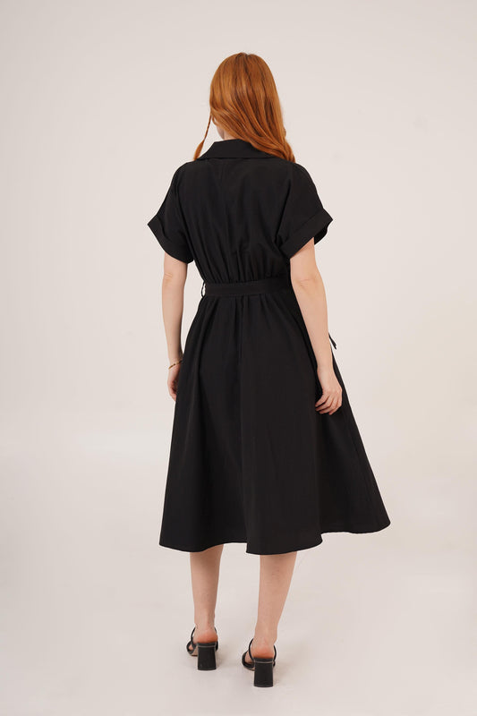 Black Dress With Shirt Collar, Hidden Buttoned, Belt pockets