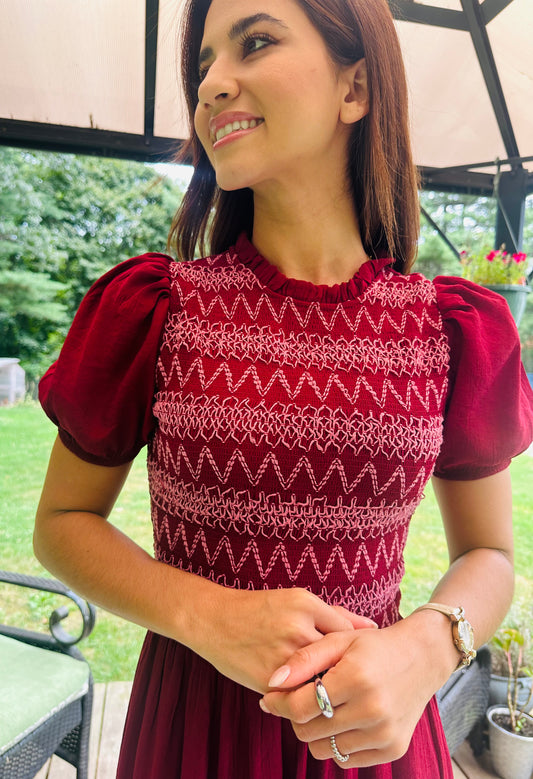 Contrast Smocked Detail Puff Sleeve Midi Dress - Dark Red