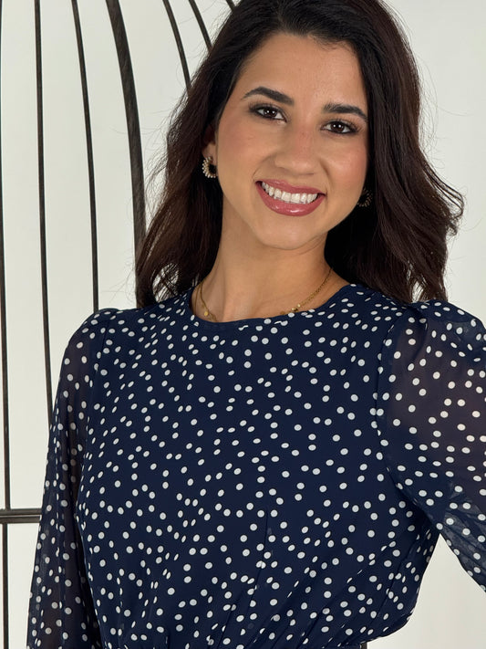 Dot Print Lantern Sleeve Belted Midi Dress - Navy