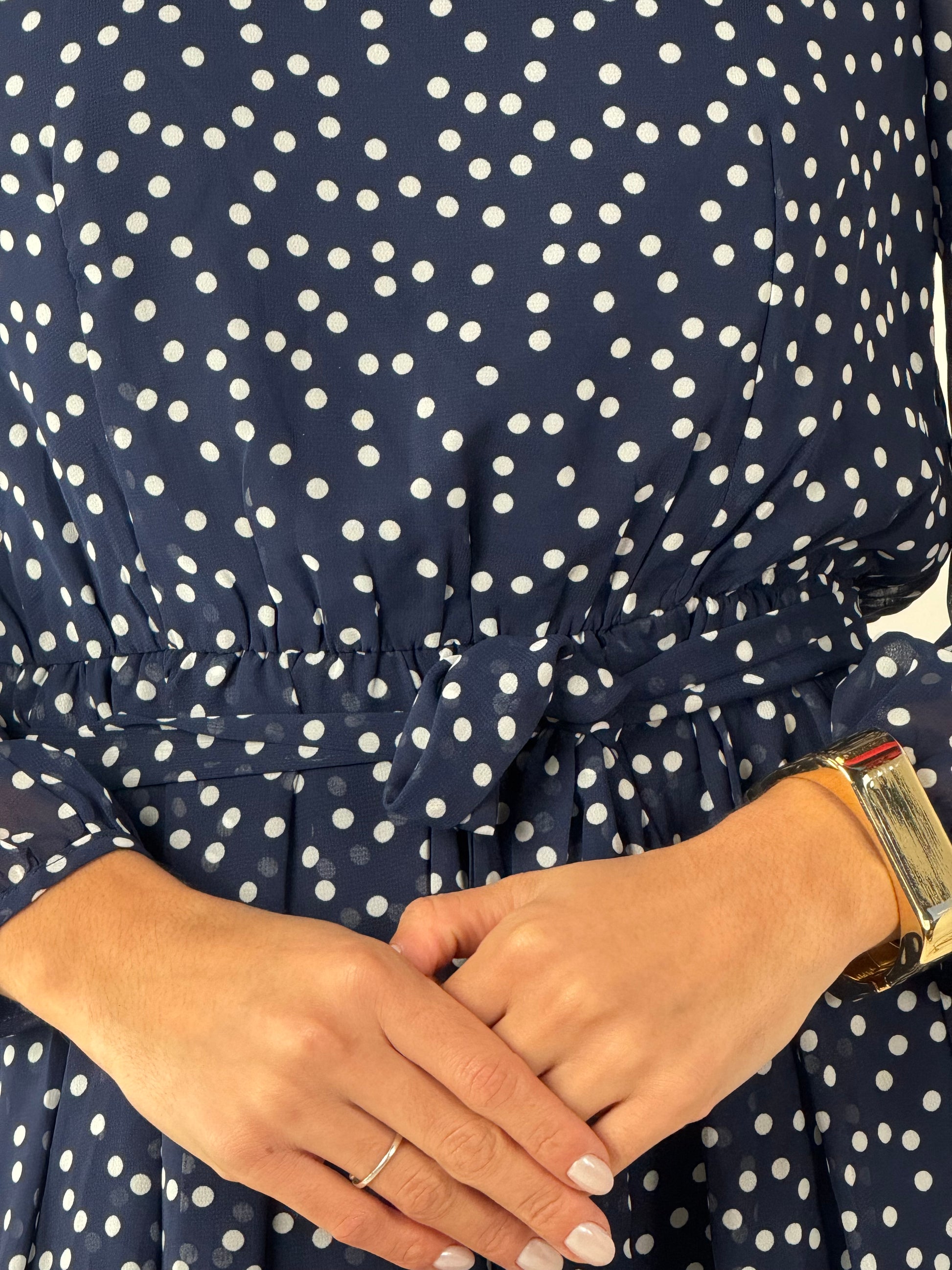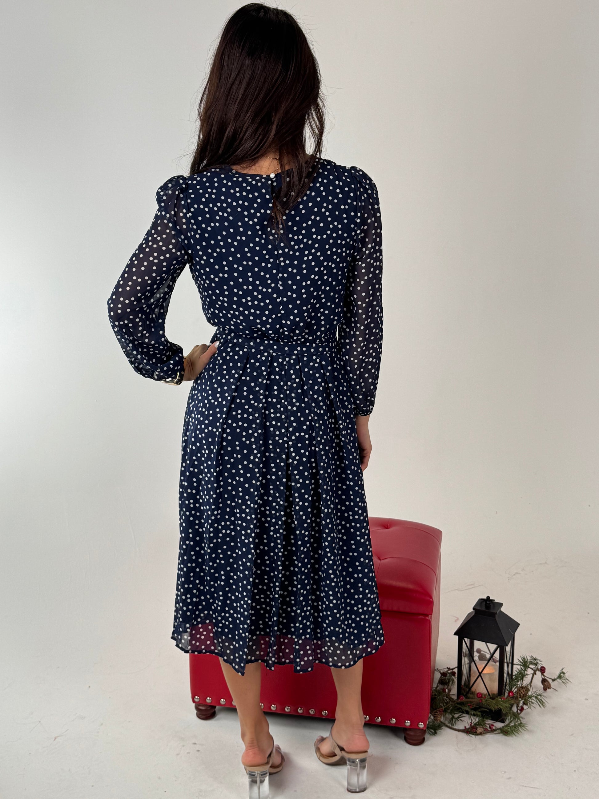 Dot Print Lantern Sleeve Belted Midi Dress - Navy