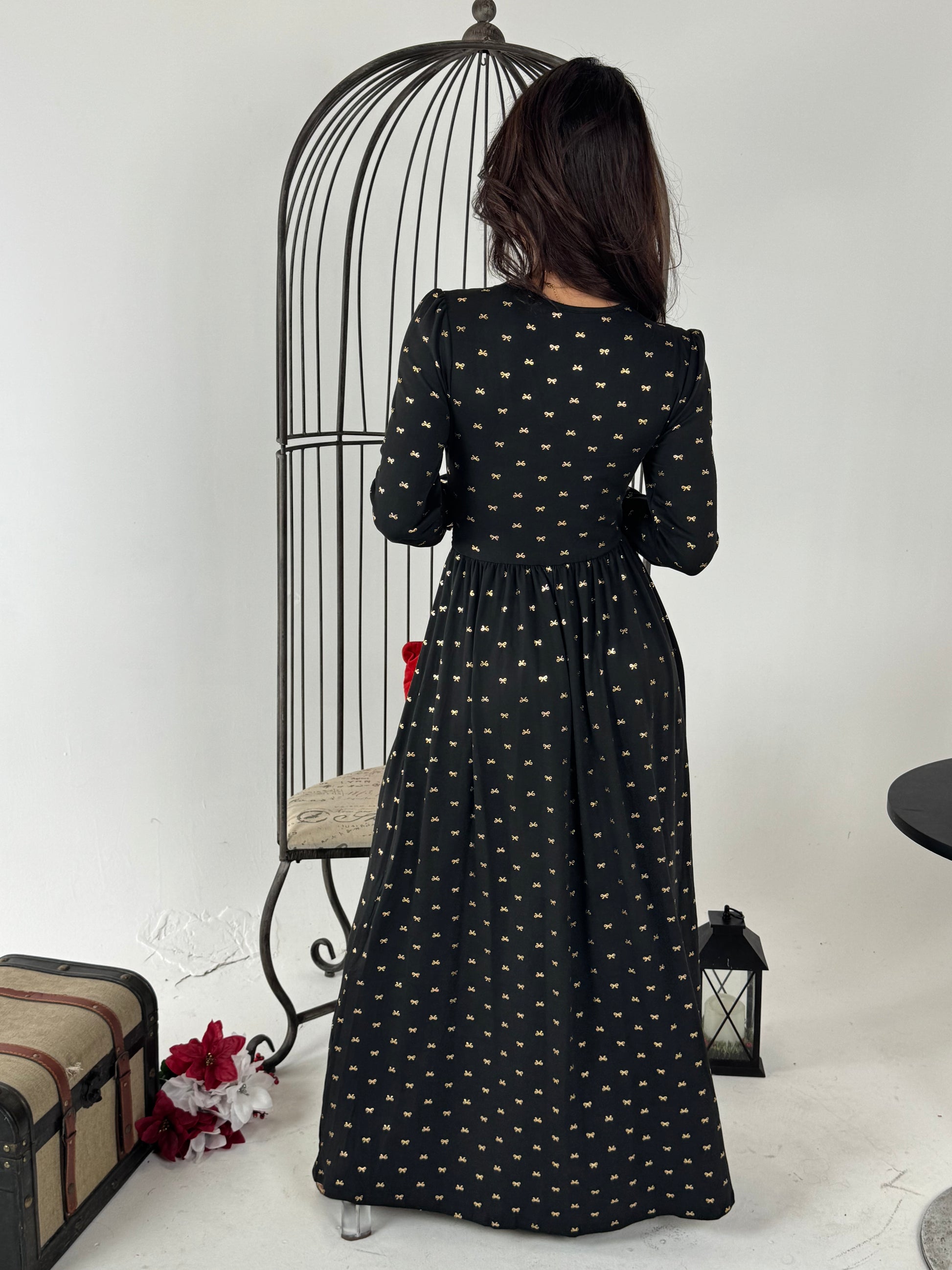 Elegant Vintage V Neck Lace Print Maxi Dress with Gold Bow