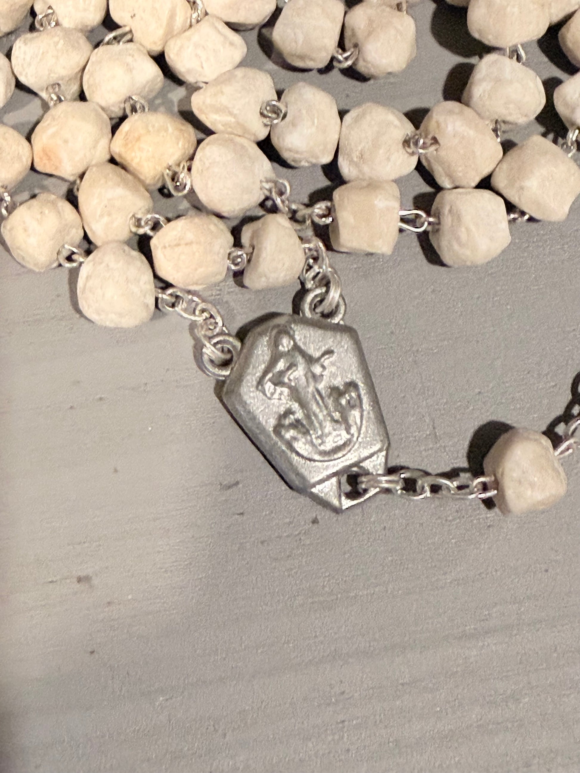 Rosario de Medjugorje elaborado con piedras y tierra en su parte central.