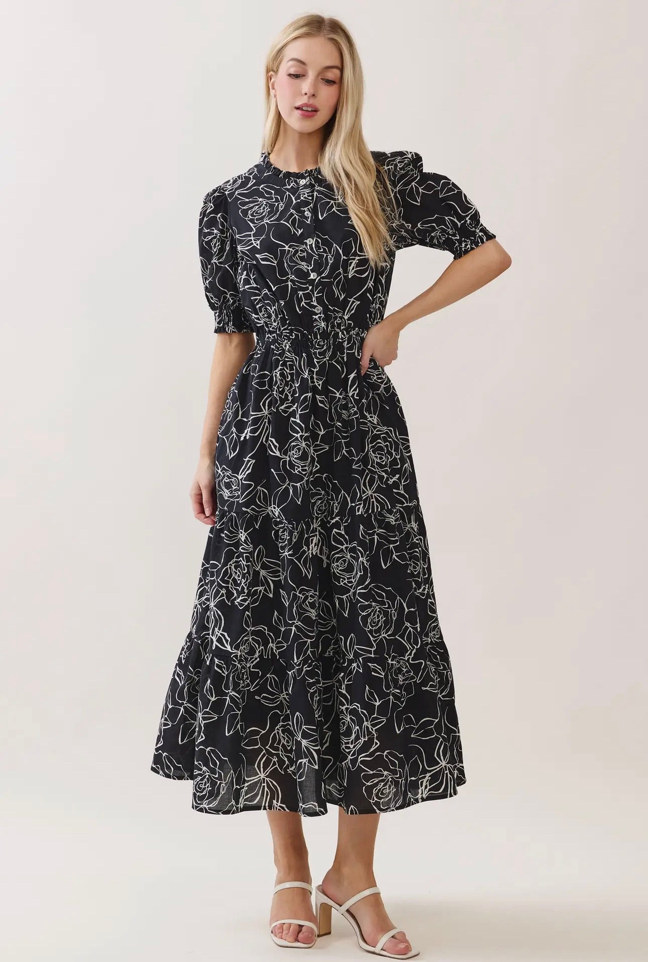 -High neck ruffle detailed button down top midi tiered dress
