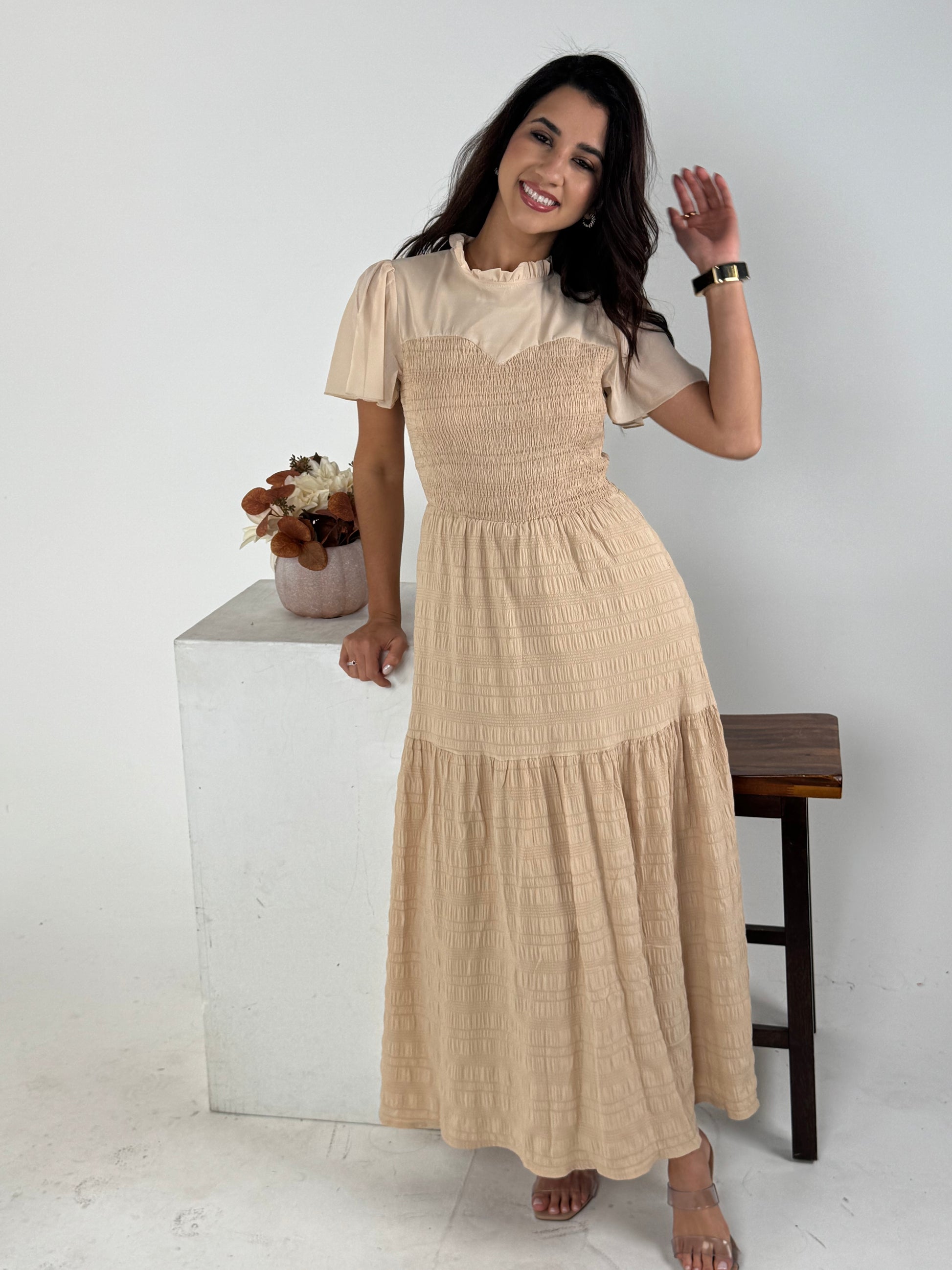 Ruffle Sleeve and Hem Top Shirred Crew Neck Dress - Khaki